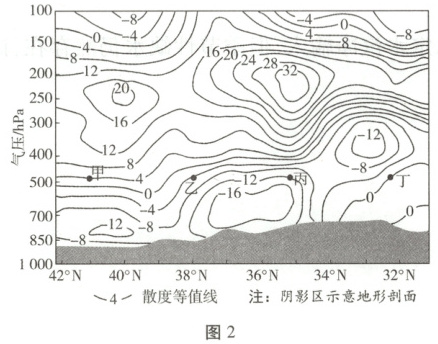 解题思路根据材料及所学知识可知,暴雪天气的形成需满足近地面散度小于0(气流辐合),高空散度大于0(气流辐散),数值差异越大,暴雪天气出现的可能性越大。读图可知,在36°N附近,近地面和高空均存在闭合的散度等值线,近地面闭合等值线的散度值为−16,明显小于周围地区,高空闭合等值线中心的散度值明显高于周边地区,说明36°N附近近地面空气辐合强度大,高空气流辐散强度大,在垂直方向上气流剧烈上升,易形成暴雪天气。故B项正确。