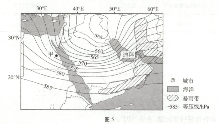 [2024·甘肃卷,9—11T,9分]2024年4月中旬,常年炎热干燥的波斯湾附近出现多个雷暴雨团,形成暴雨带,迪拜24小时内降水量超过160毫米,约为多年平均降水量的2倍。此类极端天气过程的形成与中纬度西风带的南移波动有关。下图示意暴雨时该区域500百帕高度气压分布。据此完成11—13题。