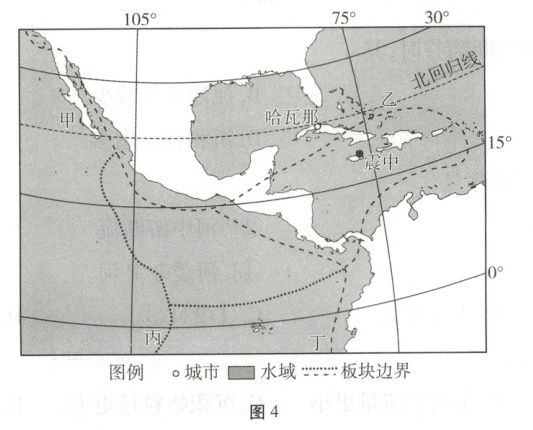 解题思路 读图可知,图中陆地区域为美洲中部地区,图中有两种板块边界,结合所学知识可知,甲、乙、丁三地附近为板块消亡边界,丙附近为板块生长边界,此次地震震中位于板块消亡边界附近,B项正确;大西洋中脊位于美洲板块、亚欧板块和非洲板块的交界处,此次地震震中位于美洲板块内部,A项错误;震源的位置属于美洲板块,不属于太平洋板块,C项错误;地震会引发海啸,但图中显示哈瓦那位于岛屿北部的沿海地区,由于岛屿阻挡,海啸对哈瓦那的影响相对较小,D项错误。