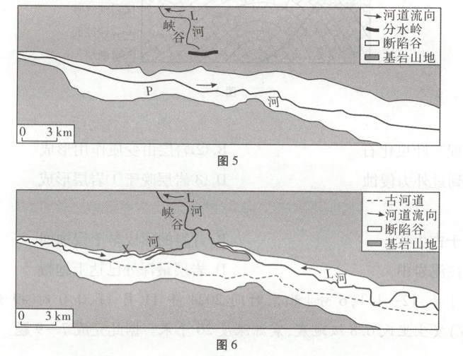 [2025·辽宁卷,14—16T,9分]青藏高原某断陷谷地势西高东低,海拔3470—3650米。距今1.8万年前,断陷谷中的P河沉积了深厚的松散物质。分水岭以北,L河源区发育了深切峡谷,河床海拔3280—3320米。距今1.8万年以来,L河通过溯源侵蚀切穿分水岭,在断陷谷内向上游持续延伸近80千米。此后,L河的支流X河开始发育。图5、图6分别示意距今1.8万年前和现代断陷谷及其周边地貌与水系格局。据此完成10—12题。