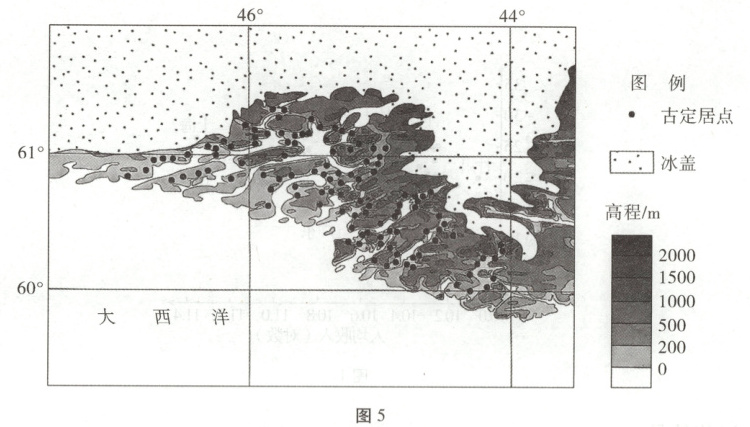 (1)问,读图可知,维京人古定居点在图示区域内分布并不均匀,他们集中分布在低地或谷地等地势平坦开阔的区域。原因:格陵兰岛纬度较高,气候寒冷,热量条件差,低地或谷地海拔较低地形较为封闭,背风,受冷空气影响小,热量不宜扩散,气温相对较高,适宜人类居住;格陵兰岛绝大部分区域被冰盖覆盖,沿海低地局部地区有土地出露,生长着苔原植被,利于农牧业生产,便于生产生活;该地区陆地所提供的食物较少,在水域或峡湾地区定居,方便船舶停靠,利于进行捕捞活动,便于获取淡水及食物。第