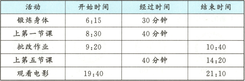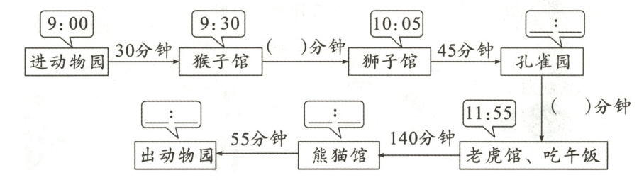 3.将小明“动物园一日游”的时间填写完整。(用24时计时法表示)