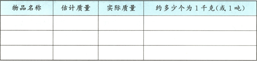 |物品名称|估计质量|实际质量|约多少个为1千克|