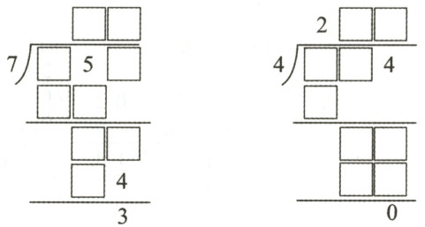 (竖式方框具体填写:左式商22,被除数157,乘积14、14;右式商216,被除数864,乘积8、4、24)