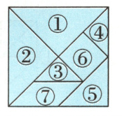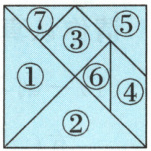 3.下面的图形都是用右图七巧板中的几块板拼成的,它们各用了哪几块板?拼成的是什么图形?在下面的括号里填一填。