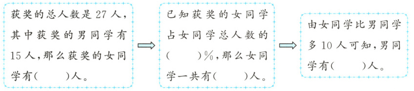 (4)(创新)实验小学组织同学们参加“雏鹰”杯作文比赛,其中女同学比男同学多10人,评选结果是男同学有15人获奖,女同学有30%获奖。已知获奖的总人数是27人,参加比赛的男同学一共有多少人?