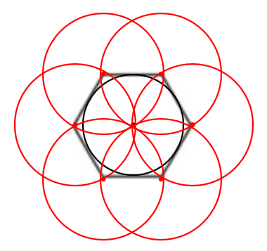 4.以下图中正六边形的每个顶点为圆心,以一条边的长为半径画圆,再画出正六边形内最大的圆。