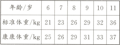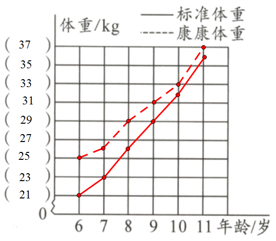 1. 下面是康康 6~11 岁每年在校健康测试时测得的体重与标准体重的对比统计表。