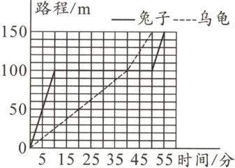 2. 下面的折线统计图表示的是乌龟和兔子赛跑的路程和时间的关系。乌龟从出发到赶上兔子用了 (