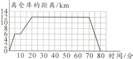 知识迁移(教材 P83~84 例题变式题)可可家在商场买了一台空调,下图反映的是商场送货师傅从仓库出发到可可家安装空调,然后返回仓库的行程情况。看图回答问题。