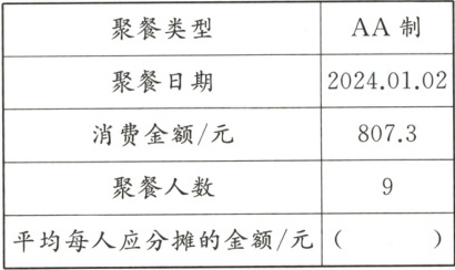 2.(创新)AA 制是指每人平均分担所需的费用。下面是小雅的妈妈和公司同事聚餐的具体消费情况,请你将表格填写完整。
