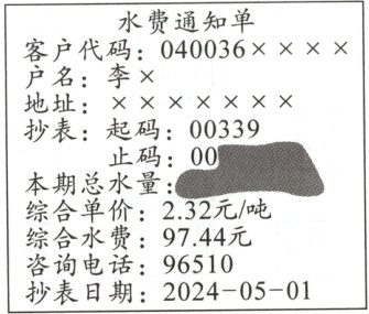 5.下面是李奶奶家收到的4月份的水费通知单,单子上有一处不慎被污渍污染了。李奶奶家4月份用了(