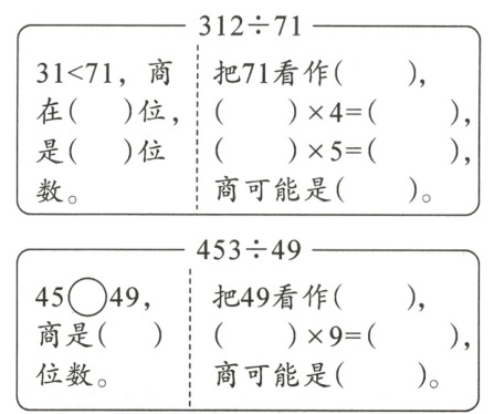 1. 先想一想把除数看作几十来试商,填在括号里,再用竖式计算。