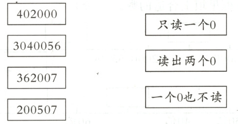 1.402000一个0也不读;3040056读出两个0;362007只读一个0;200507读出两个0(注:原答案未明确呈现连线内容,这里按常规逻辑补充)
