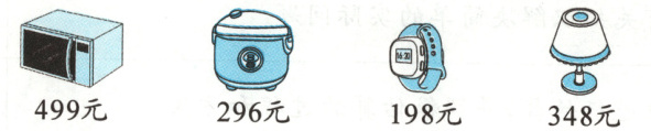 (1)296+198+348=842(元) 买一个电饭煲、一块手表和一盏台灯花钱最少,最少需要842元。