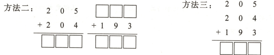 方法一:$200 + 200 + 200 = ( \quad )$ $( \quad ) + ( \quad ) - ( \quad ) = ( \quad )$