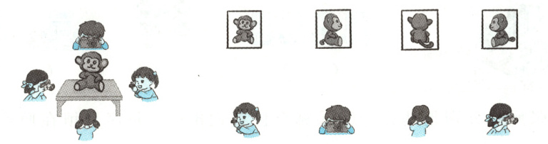3.下面的四张照片分别是哪位小朋友拍到的?把他们的名字填在括号里。