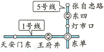 4. 新情境 地铁每行驶一站平均需要$3$分,从$1$号线换乘$5$号线大约需要$5$分。晓雯乘地铁从“天安门东”前往“张自忠路”共需要多长时间?