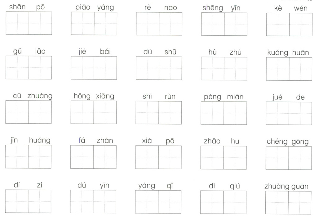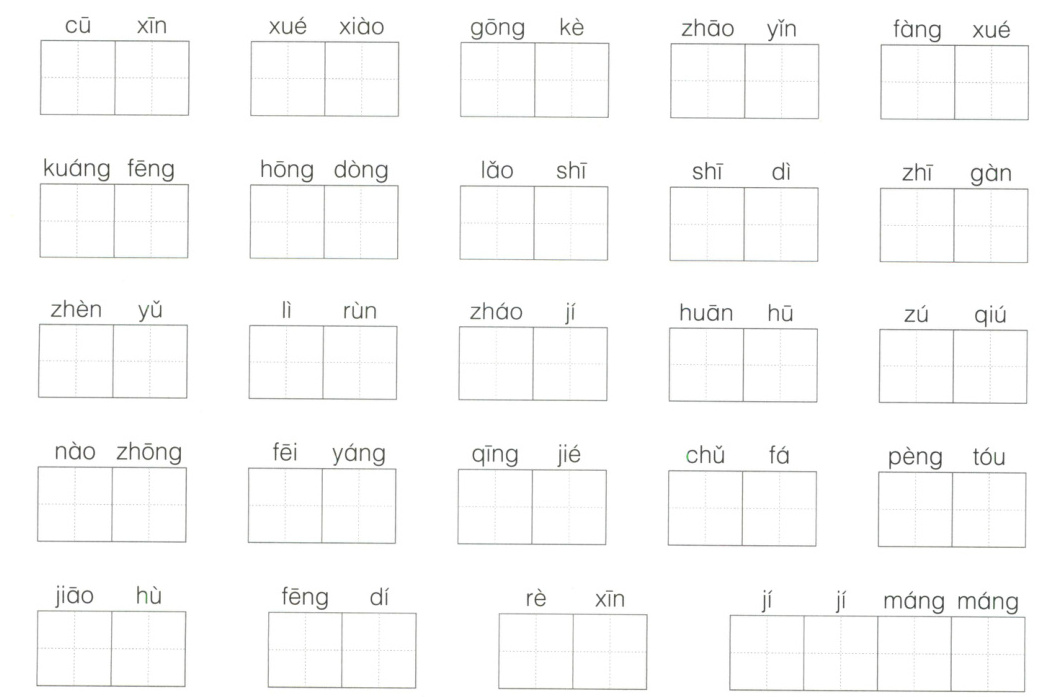 答案: 山坡 飘扬 热闹 声音 课文 古老 洁白 读书 互助 狂欢 粗壮 轰响 湿润 碰面 觉得 金黄 罚站 下坡 招呼 成功 笛子 读音 扬起 地球 壮观 粗心 学校 功课 招引 放学 狂风 轰动 老师 师弟 枝干 阵雨 滋润 着急 欢呼 足球 闹钟 飞扬 清洁 处罚 碰头 交互 风笛 热心 急急忙忙
