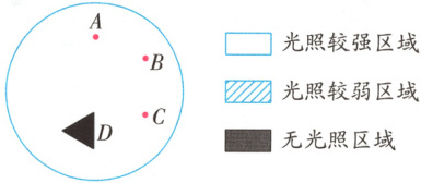 5. (思维过程)如图,某圆形广场中有 A,B,C 三个照明灯,D 处是一座电视塔,请在图中画出哪些区域光照较强,哪些区域光照较弱,哪些区域没有光照到。