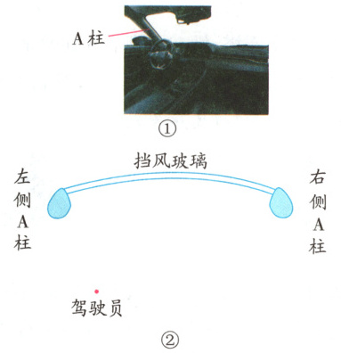 4. (生活应用)如图①,汽车挡风玻璃两侧的 A 柱(左、右各一个)会遮挡驾驶员的视线。请在图②中画出驾驶员视线被遮挡的区域。