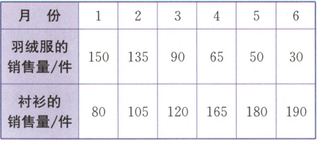 (2)羽绒服的销售量逐月减少,衬衫的销售量逐月增加。从1月到6月,天气逐渐变暖。