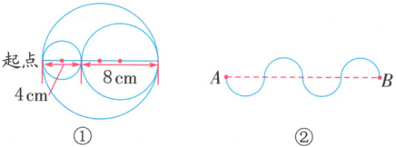 )。(3) 如图②,已知$AB = 40 cm$,一只蚂蚁从点 A 沿着 4 个半圆(实线部分)爬行到点 B 处。这只蚂蚁的行程是多少厘米?
