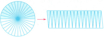 解析:把这个圆剪拼成近似的梯形,圆的周长被平均分成了16份,梯形的上、下底共8份,所以梯形的上、下底之和是圆周长的$\frac{8}{16}。$梯形的高是2r,则梯形的面积$=(2\pi r×\frac{8}{16})×2r÷2=\pi r²,$所以圆的面积计算公式为$S=\pi r²。$