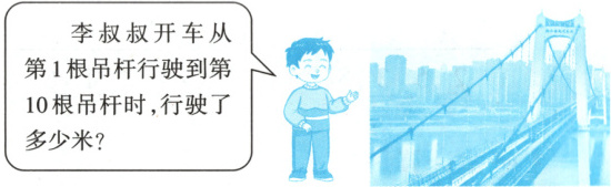 从第1根吊杆到第10根吊杆,中间间隔数为:$10 - 1 = 9$(个),