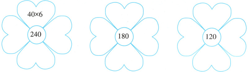 左图花瓣可填30×8,60×4,24×10;中图花瓣可填20×9,30×6,90×2;右图花瓣可填30×4,20×6,40×3(答案不唯一)
