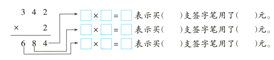 2. 学校买了$342$支签字笔,每支$2$元。一共用了多少元?