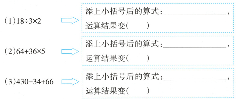 6. 先计算,再给这三道题添上小括号,使运算结果变大或变小(写出添上小括号后的算式,并计算出结果)。