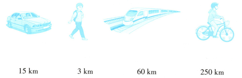 15km-自行车,3km-步行,60km-汽车,250km-高铁