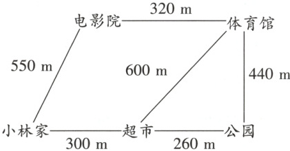 3. 路线三:小林家→超市→公园→体育馆,距离:300+260+440=1000米;