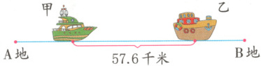 4. (六安霍山)如图,甲、乙两艘轮船同时从A地出发前往B地,乙轮船每时行驶的路程是甲轮船的$1.1$倍,$18$时后两船相距$57.6$千米。甲轮船和乙轮船每时各行驶多少千米?