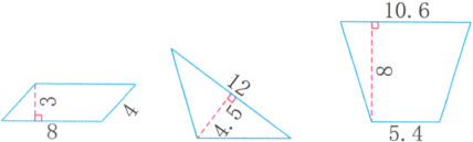 2. 8×3=24(平方米) 12×4.5÷2=27(平方米) (10.6+5.4)×8÷2=64(平方米)
