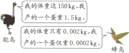 (2)答案不唯一,如鸵鸟产的一个蛋的质量是蜂鸟的多少倍? 1.5÷0.0002=7500