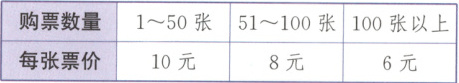 (2)按45人购票:45×10=450(元) 按51人购票:51×8=408(元) 450>408按51人购票最省钱解析:解答此类题时要灵活选择购票方案,有时购票张数可以超出人数,因为虽然购票数量增加,但是用的钱数要比按实际人数购票用的钱数更少。