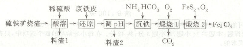 15. (14 分)四氧化三铁俗称磁性氧化铁,常用于制造录音磁带和电讯器材,也可作颜料和抛光剂。某工厂以硫铁矿烧渣(主要含有${Fe}$、${Al}$、${Ca}$的氧化物及${SiO2}$)为原料,制备${Fe3O4}$的工艺流程如图所示。
