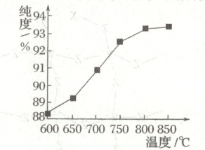 (6)“煅烧$2$”时温度对${Fe3O4}$的纯度有很大影响。已知温度对${Fe3O4}$纯度的影响如图所示,则“煅烧$2$”时,温度最好控制在_______${^{\circ}C}$;“煅烧$2$”阶段应控制$\frac{n({FeS2})}{n({Fe2O3})}$的最佳比例为_______。