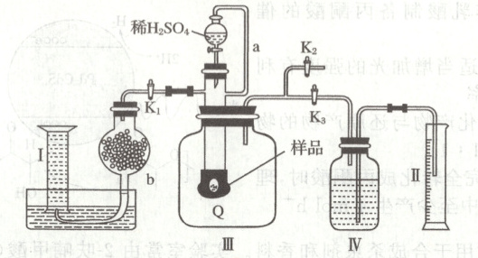 11.D [关闭$K_{2}$,打开$K_{1}$、$K_{3}$,$Na_{2}O_{2}$样品与硫酸反应放出二氧化碳和氧气,Q膨胀排出Ⅲ内的空气,根据Ⅱ收集到水的体积即为产生二氧化碳和氧气的总体积;反应结束后,关闭$K_{3}$,打开$K_{1}$、$K_{2}$,Q中气体排入b,二氧化碳被b中碱石灰吸收,量筒Ⅰ收集到氧气。b的作用是为了除去气体中的$CO_{2}$,故b中应装碱石灰,A错误;反应产生的$O_{2}$和$CO_{2}$使气囊变大,将Ⅲ中的气体排出,水进入量筒Ⅱ中,所以量筒Ⅱ中水的体积即为产生$O_{2}$和$CO_{2}$的总体积,所以滴加稀硫酸前必须关闭$K_{1}$、$K_{2}$,打开$K_{3}$,B错误;结合分析可知,量筒Ⅱ用于测量产生的氧气和$CO_{2}$总体积,量筒Ⅰ用于测量产生的$O_{2}$体积,C错误;量筒Ⅰ收集的气体是氧气,若量筒Ⅰ收集的气体折算后为0.01 mol,则过氧化钠的物质的量为0.02 mol,则2 g已变质的样品中的$Na_{2}O_{2}$质量为1.56 g,D正确。]