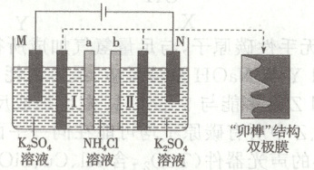 13. 用一种具有“卯榫”结构的双极膜组装的电解池可实现大电流催化电解氯化铵废水,同时制得盐酸和氨水。工作时,${H_{2}O}$在双极膜界面处被催化解离成${H^{+}}$和${OH^{-}}$,有利于电解反应顺利进行,装置如图所示(${M}$、${N}$均为惰性电极)。下列说法正确的是(