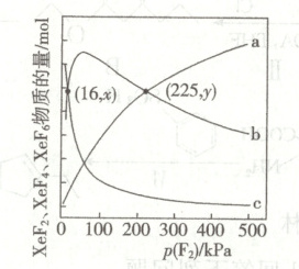 ②一定温度下,1 mol Xe与一定量$F_{2}$通入恒压反应容器发生反应Ⅰ、Ⅱ、Ⅲ,初始生成$XeF_{2}$,随着氟气的通入使得$XeF_{2}$逐渐转化为含氟更多的氟化物,故a、b、c分别$XeF_{6}$、$XeF_{4}$、$XeF_{2}$,故$XeF_{6}$物质的量所对应的曲线为a。x和y分别是题图中两个交点的纵坐标,分别是$XeF_{2}$、$XeF_{4}$的物质的量及$XeF_{4}$、$XeF_{6}$的物质的量,由于二者相等,根据元素守恒有$n(Xe) + n(XeF_{2}) + n(XeF_{4}) + n(XeF_{6}) = 1\ mol$,$n(XeF_{2}) = n(XeF_{4}) = \frac{1\ mol - n(Xe) - n(XeF_{6})}{2}$,$n(XeF_{4}) = n(XeF_{6}) = \frac{1\ mol - n(XeF_{2})}{2}$(此点n(Xe)近似为零),通过图像向下作垂线分别找到与$XeF_{6}$和$XeF_{2}$的交点,不难看出左边的交点高于右边,左边再加上Xe,应该更高一点,因此x < y。