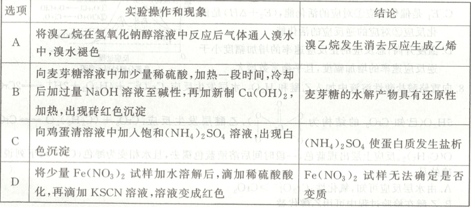 12.B [溴乙烷在${NaOH}$醇溶液中发生消去反应生成乙烯,气体可使溴水褪色,结论合理,A正确;麦芽糖本身是还原性糖,若水解不完全,未水解的麦芽糖在碱性条件下可直接与新制${Cu(OH)_{2}}$反应生成砖红色沉淀,无法证明水解产物的还原性,结论错误,B错误;饱和${(NH_{4})_{2}SO_{4}}$溶液使蛋白质盐析,现象与结论一致,C正确;酸性条件下${NO^{-}_{3}}$会氧化${Fe^{2+}}$为${Fe^{3+}}$,导致溶液变红,无法判断${Fe(NO_{3})_{2}}$是否变质,结论正确,D正确。]