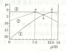 14.C [溶液${pH}$增大、${pOH}$减小,二元弱酸${H_{3}PO_{3}}$溶液中${H_{3}PO_{3}}$的浓度减小,${H_{2}PO^{-}_{3}}$的浓度先增大后减小,${HPO^{2-}_{3}}$的浓度增大,则曲线①表示${H_{3}PO_{3}}$、曲线②表示${H_{2}PO^{-}_{3}}$、曲线③表示${HPO^{2-}_{3}}$;由图可知,溶液中${H_{3}PO_{3}}$和${H_{2}PO^{-}_{3}}$浓度相等时,溶液${pOH}$为$12.6$,则${H_{3}PO_{3}}$的电离常数$K_{a1}=\dfrac{c({H_{2}PO^{-}_{3}})· c({H^{+}})}{c({H_{3}PO_{3}})}=c({H^{+}})=10^{-1.4}$,同理可知,${H_{3}PO_{3}}$的电离常数$K_{a2}=\dfrac{c({HPO^{2-}_{3}})· c({H^{+}})}{c({H_{2}PO^{-}_{3}})}=c({H^{+}})=10^{-6.7}$。曲线③表示${HPO^{2-}_{3}}$,A错误;${H_{3}PO_{3}}$的$K_{a1}=\dfrac{c({H_{2}PO^{-}_{3}})· c({H^{+}})}{c({H_{3}PO_{3}})}=c({H^{+}})=10^{-1.4}$,B错误;由电离常数可知,${H_{2}PO^{-}_{3}}$的水解常数$K_{h}=\dfrac{K_{w}}{K_{a1}}=\dfrac{1.0× 10^{-14}}{1.0× 10^{-1.4}}< K_{a2}=10^{-6.7}$,则${H_{2}PO^{-}_{3}}$在溶液中的电离程度大于水解程度,${NaH_{2}PO_{3}}$溶液中${H_{3}PO_{3}}$的浓度小于${HPO^{2-}_{3}}$的浓度,C正确;由图可知,$b$点为${H_{3}PO_{3}}$和${HPO^{2-}_{3}}$的浓度相等的混合溶液,与${H_{3}PO_{3}}$溶液相比,$b$点溶液加入了碱,由电荷守恒关系可知,$b$点溶液中离子浓度的关系为$c({H^{+}})< c({H_{2}PO^{-}_{3}})+2c({HPO^{2-}_{3}})+c({OH^{-}})$,D错误。]