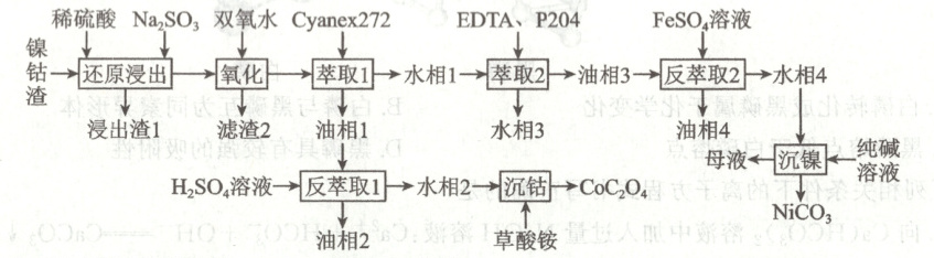 15. (16 分) 从镍钴渣 (主要成分为 $CoO 、 Co_{2} O_{3} 、 NiO$, 少量 $Fe_{2} O_{3} 、 SiO_{2}$ ) 中提取碳酸镍并制备草酸钴晶体 $(CoC_{2} O_{4} · 2 H_{2} O)$ 的工艺流程如下, 回答下列问题: