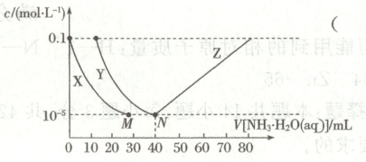 13.D [由于Ksp[Zn(OH)2]<Ksp[Fe(OH)2],向10mL浓度均为0.1mol·L−1的FeSO4和ZnSO4的混合溶液中加入0.1mol·L−1氨水,Zn2+先沉淀,分析图像,曲线X表示Zn2+,曲线Y表示Fe2+,曲线Z表示[Zn(NH3)4]2+。曲线Y表示Fe2+,A错误;N点c(Fe2+)=10−5mol·L−1,pH=8.95,c(H+)=10−8.95mol·L−1,c(OH−)=Kw/c(H+)=1×10−14/10−8.95mol·L−1=10−5.05mol·L−1,Ksp[Fe(OH)2]=c(Fe2+)·c2(OH−)=1×10−5×(10−5.05)2=10−15.1,B错误;N点锌元素的主要存在形式为Zn(OH)2,N点以后,锌元素主要以[Zn(NH3)4]2+形式存在,C错误;由M点数据可知,Ksp[Zn(OH)2]=1×10−5×(1×10−14/10−8.04)2=10−16.92,反应Zn(OH)2+4NH3⇌[Zn(NH3)4]2++2OH−的K=c([Zn(NH3)4]2+)·c2(OH−)/c4(NH3)=c([Zn(NH3)4]2+)·c2(OH−)·c(Zn2+)/c4(NH3)·c(Zn2+)=K稳·Ksp[Zn(OH)2]=109.06×10−16.92=10−7.86,D正确。]