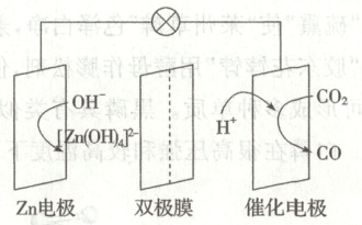 14. 水系 $Zn-CO_{2}$ 电池在碳循环方面具有广阔的应用前景。该电池的示意图如下, 其中双极膜在工作时催化 $H_{2} O$ 解离为 $H^{+}$ 和 $OH^{-}$, 并在直流电场的作用下分别向两极迁移。下列说法正确的是(