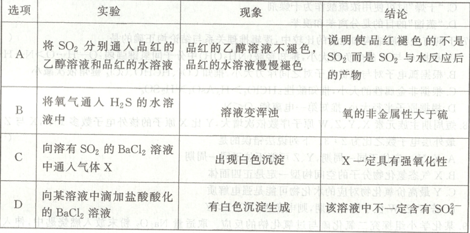 11.C [将${SO_{2}}$分别通入品红的乙醇溶液和品红的水溶液,观察到品红的乙醇溶液不褪色,而品红的水溶液慢慢褪色,可以说明使品红褪色的不是${SO_{2}}$,而是${SO_{2}}$与水反应后的产物,A不符合题意;将氧气通入${H_{2}S}$的水溶液中,溶液变浑浊说明发生反应:${O_{2} + 2H_{2}S\xlongequal{}2S\downarrow + 2H_{2}O}$,则氧化性:${O_{2}}>{S}$,氧的非金属性大于硫,B不符合题意;气体${X}$可以是不具有强氧化性的氨气,向溶有${SO_{2}}$的${BaCl_{2}}$溶液中通入氨气,氨气与二氧化硫优先反应生成亚硫酸铵,然后亚硫酸铵与${BaCl_{2}}$发生复分解反应生成${BaSO_{3}}$白色沉淀,C符合题意;白色沉淀可能是${BaSO_{4}}$,也可能是${AgCl}$,溶液中不一定含有${SO^{2-}_{4}}$,也可能含有${Ag^{+}}$,D不符合题意。]