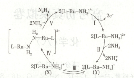 14. ${N_{2}H_{4}}$是一种强还原性的高能物质,在航天、能源等领域有广泛应用。我国科学家合成的某${Ru}$(Ⅱ)催化剂${[L-Ru-NH_{3}]^{+}}$能高效电催化氧化${NH_{3}}$合成${N_{2}H_{4}}$,其电极反应机理如图所示。下列说法错误的是(